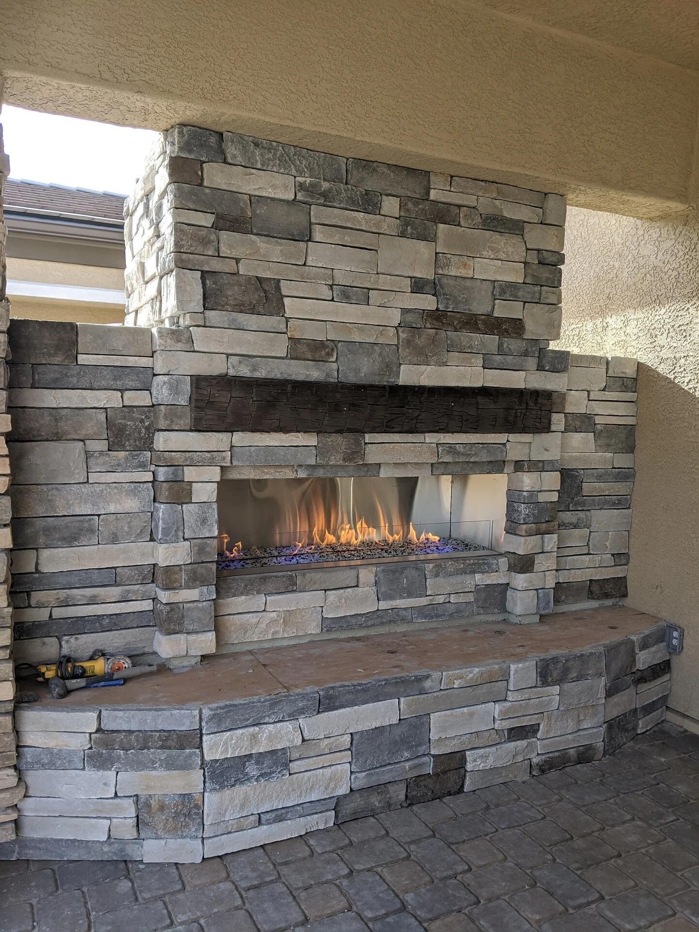 Wall stone choices: Choosing the wall stone for your outdoor fireplace can go one of two ways. Some homeowners like to create a seamless look by using wall stone in the same color tones and texture of the patio pavers. This way, the entire space can look unified.
