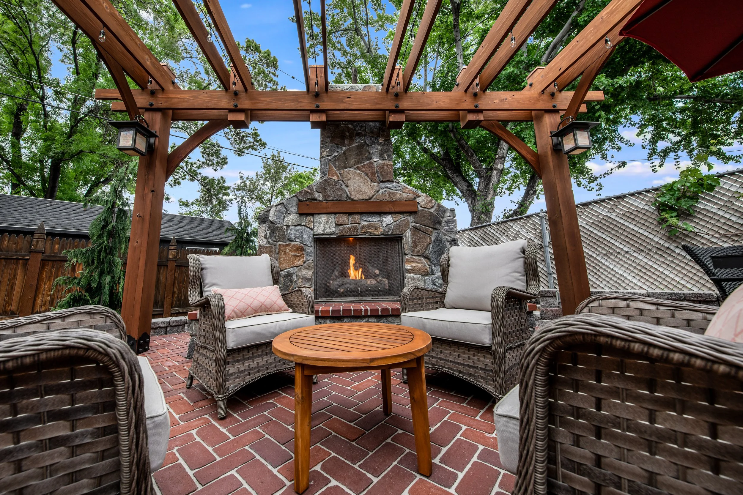 Incorporating a pavilion or pergola into your outdoor space adds style and function, providing shade and shelter for an outdoor fireplace and outdoor kitchen. It defines spaces for dining, lounging, and entertaining, enhancing privacy while maintaining an open feel. These shade structures also add architectural appeal and offer opportunities for outdoor lighting or fans, creating a comfortable, stylish environment.
